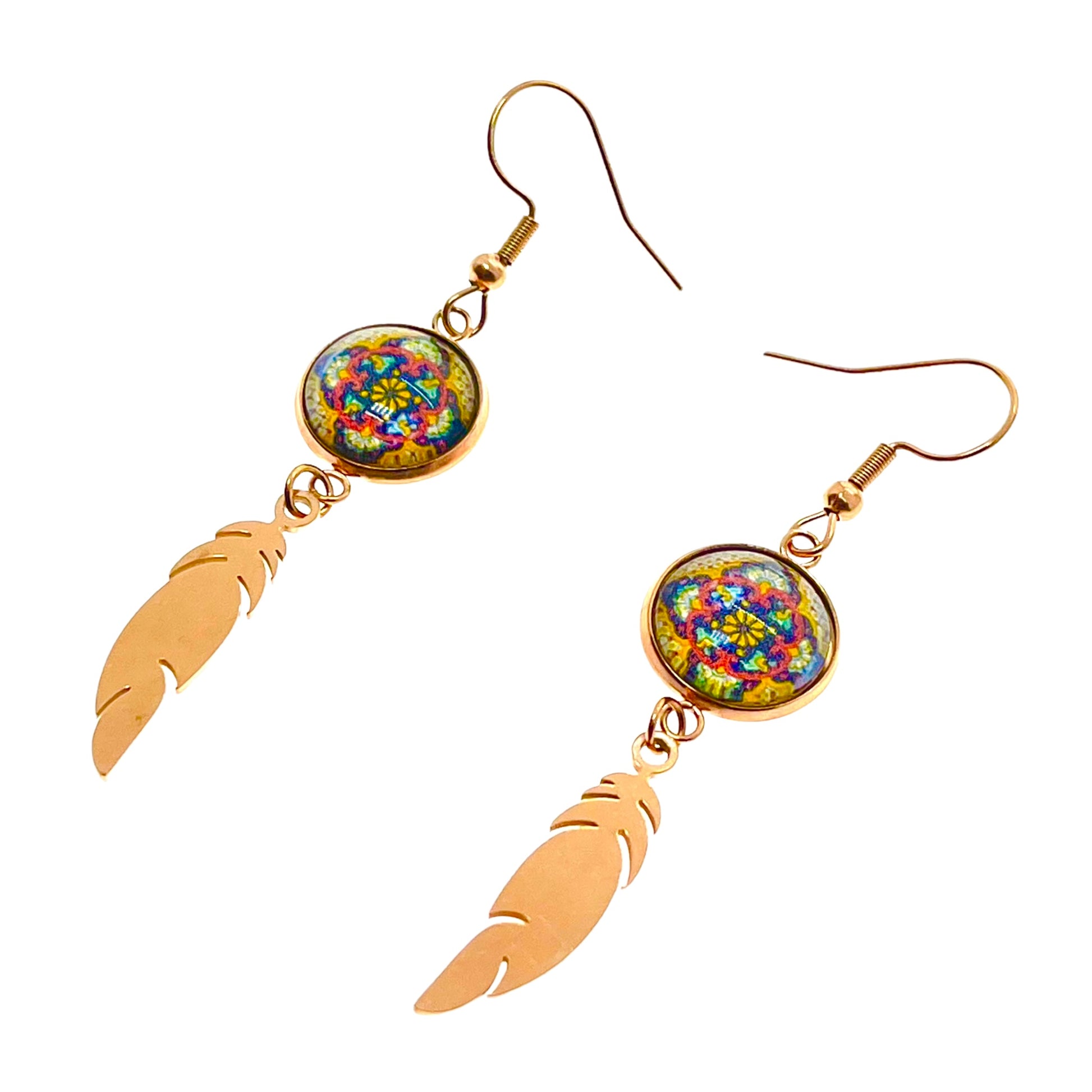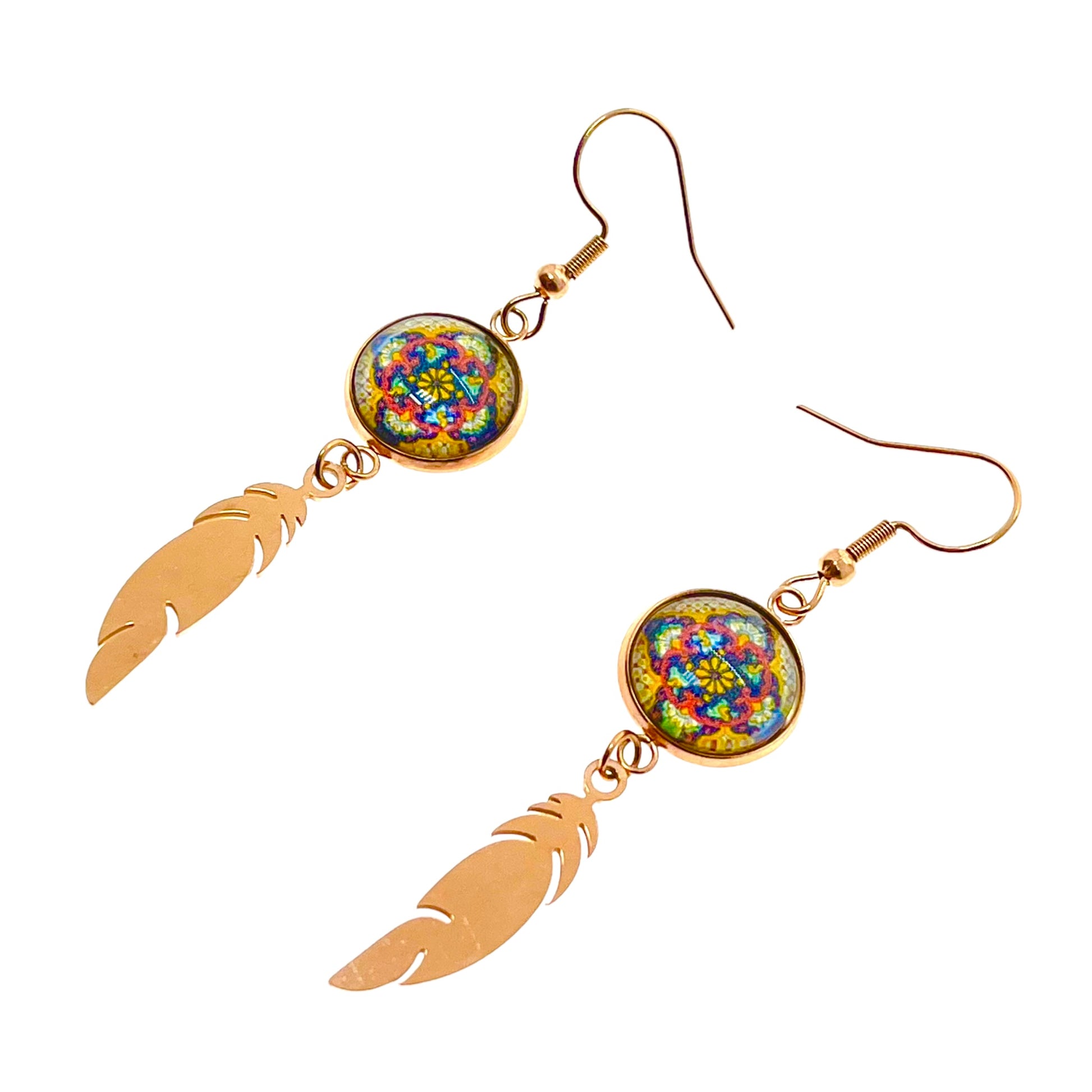 Add some hippie razzle dazzle to your wardrobe with our Golden Flower Feather Earrings. These boho beauties feature tiny and light dangling feather charms with round 12mm Photo Glass Cabochon centers imprinted with a gorgeous, iridescent multicolor flowers. This statement pair is made from Stainless Steel and is Rose Gold Plated. This jewelry set is sure to stay snug in your ears with its ear wires and rubber backing closures. This pair is sure to remain comfortable for all day wear, measuring 0.5 inches wide and 2.5 inches long. Be the Queen of Bohemian Glam when you rock our Golden Flower Feather Earrings!